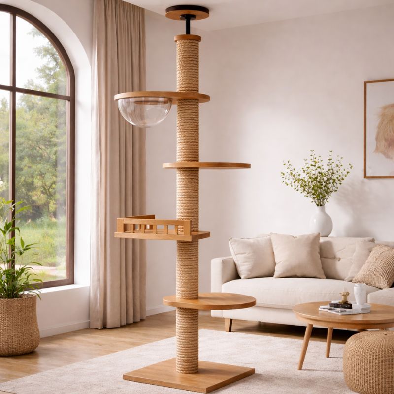 Le bois apporte une vraie stabilité et une sensation de solidité que beaucoup de chats apprécient instinctivement. En plus de son aspect naturel, il supporte mieux l’usure quotidienne, surtout dans les foyers où l’arbre à chat est utilisé plusieurs fois par jour.