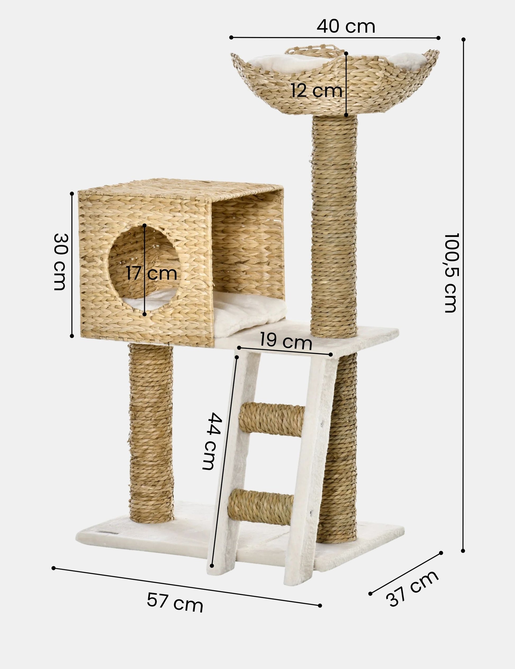 Cet arbre à chat en osier a été pensé pour offrir à votre compagnon un espace dédié, à la fois fonctionnel et esthétique, sans encombrer votre intérieur. Son design naturel et équilibré s’intègre facilement dans une décoration moderne tout en répondant aux besoins essentiels de repos, de jeu et de griffades.